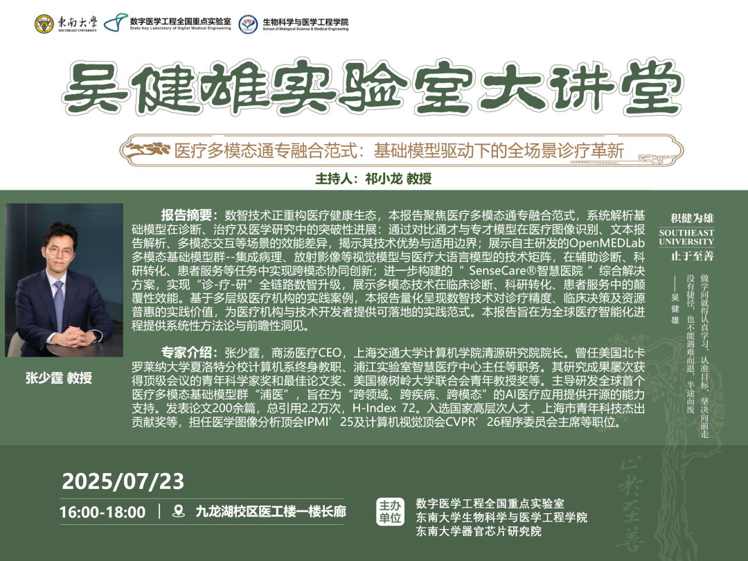 吴健雄先生是杰出女性物理学家、世界物理学界的传奇人物,被誉为“核子物理女皇”、“东方居里夫人”。作为吴健雄实验室的传承者,数字医学工程全国重点实验室、东南大学生物科学与医学工程学院联合举办“吴健雄实验室大讲堂”“吴健雄实验室青年学者讲堂”系列学术报告交流分享会。