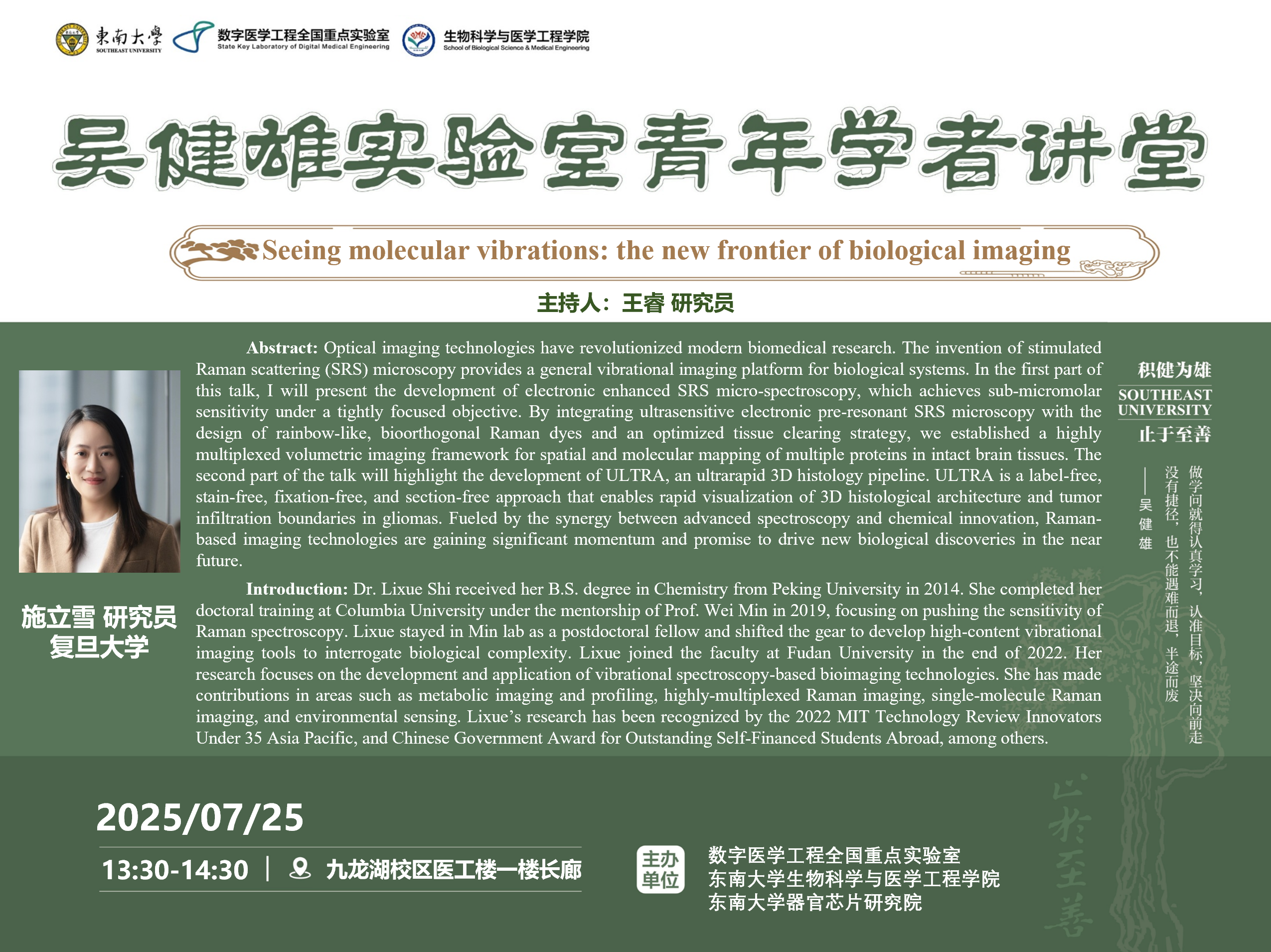 吴健雄先生是杰出女性物理学家、世界物理学界的传奇人物,被誉为“核子物理女皇”、“东方居里夫人”。作为吴健雄实验室的传承者,东南大学生物科学与医学工程学院、数字医学工程全国重点实验室联合举办“吴健雄实验室大讲堂”“吴健雄实验室青年学者讲堂”系列学术报告交流分享会。